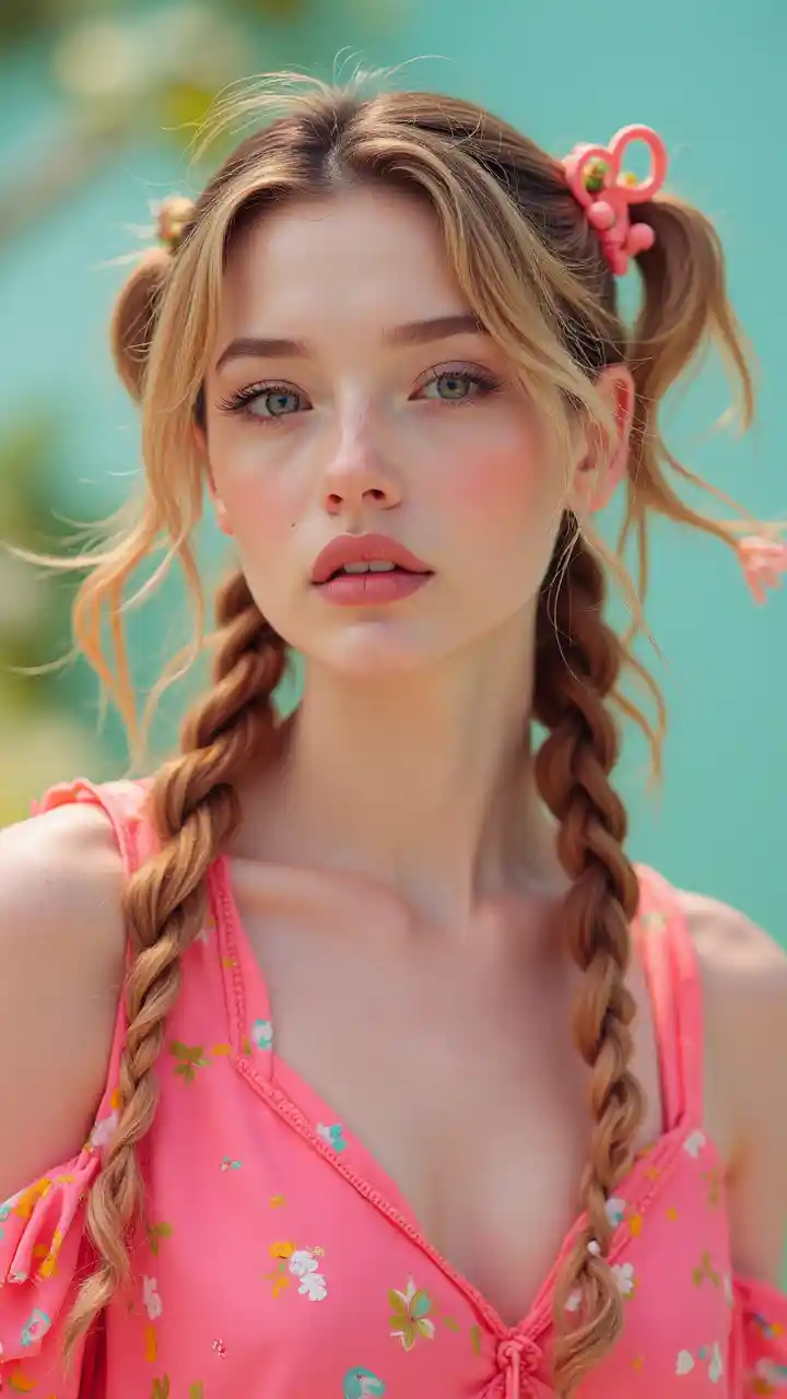 Vogue fashion model with flowing long pigtails styled in vibrant candycore hues, featuring delicate pale skin and subtle light pink lips, portrayed with a sense of whimsical elegance and bold individuality, set against a playful backdrop with a 4:5 aspect ratio.