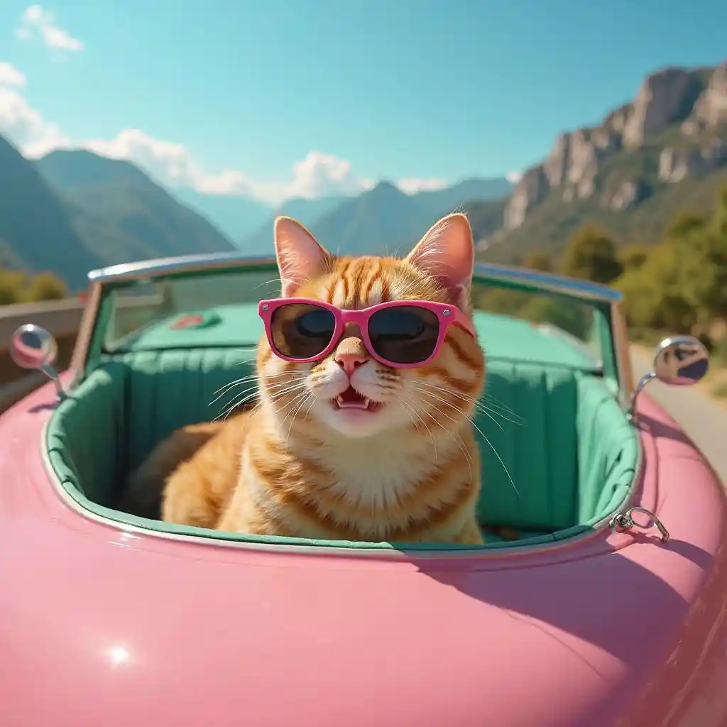 fat cat wearing sunglasses riding in open car, pink convertible with emerald green fabric inside, italian mountains background, close up of head, happy expression, cute style, bright colors, natural light, fisheye lens perspective, happy smile and fashion. --ar 9:16 --stylize 9000 --v 6.1