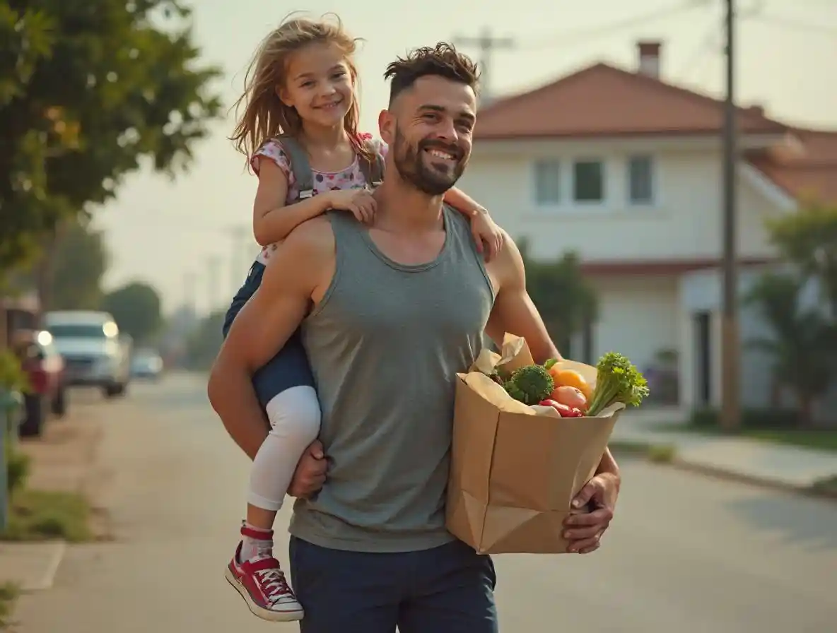 a man wearing a singlet after workout carry his daughter on his back, carrying groceries on his right arm