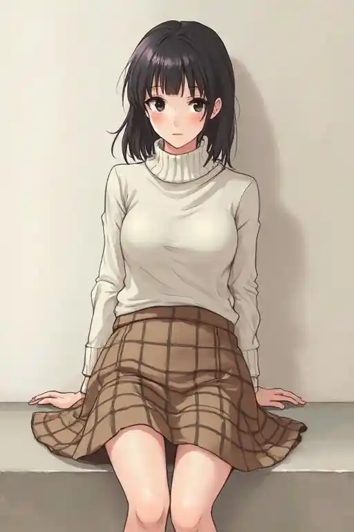 ( When climbing、 I can see the inside of the skirt 、sit with legs spread)、(( female 1 person 、 Age Female ))、(( White Turtleneck Sweater、 Brown Plaid Skirt