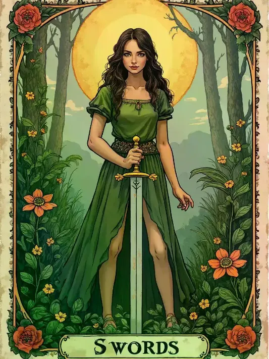 Victoriafolk hirsute kudzu monters tarot card 3 of swords, young female holding sword
