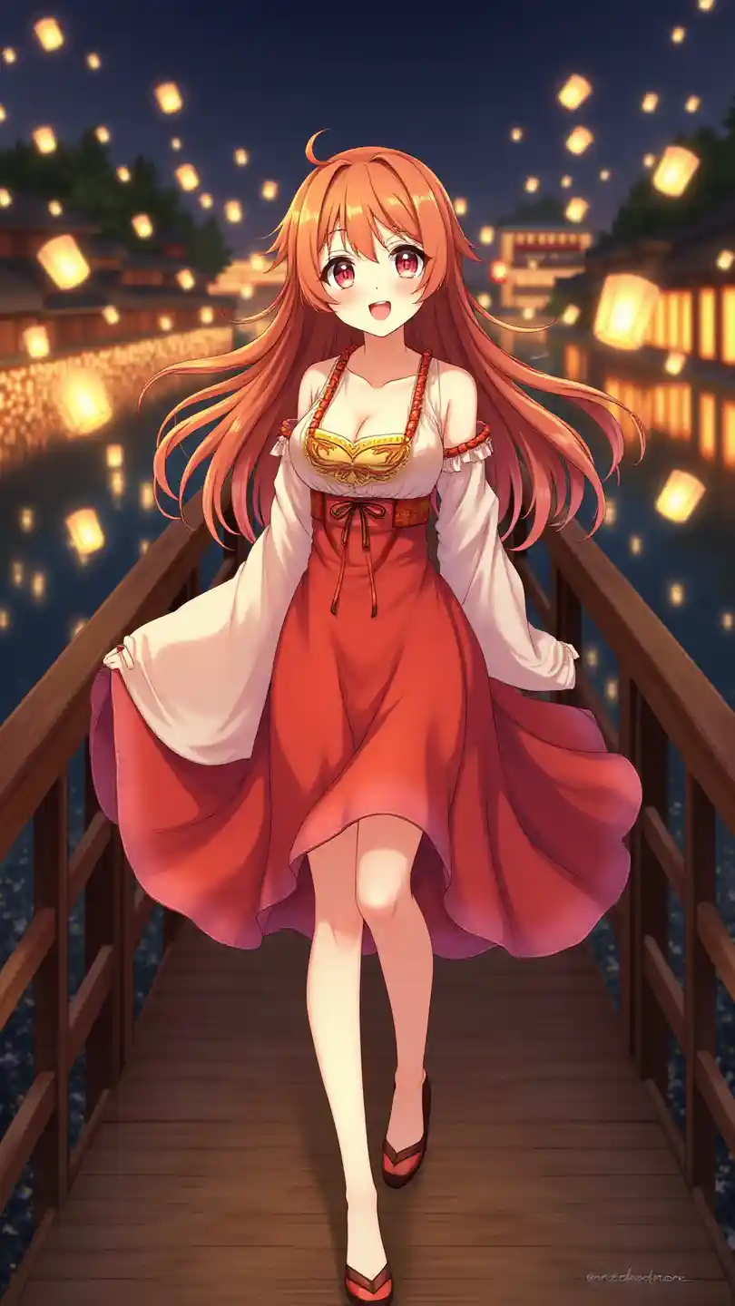 Vertical large-scale image of an Ultra HD anime girl, enchantingly beautiful and whimsical, basking in the glow of a lantern festival, standing on a wooden bridge over a river outdoors at night, wearing a traditional hanbok with a plunging neckline and sheer sleeves, her long hair glowing with lantern light and a warm smile, wide sparkling eyes, glowing skin, soft red and orange color palette, soft features, perfect makeup, festive and romantic vibes, warm lighting with a soft glow, accentuating her delicate, well-defined chest with a subtle cleavage, and long, toned legs with a poised posture, exuding charm and elegance.