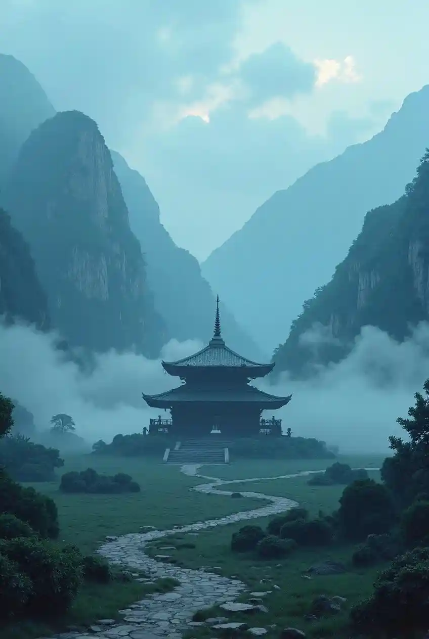 Mystical Shrine in Foggy Anime Mountains