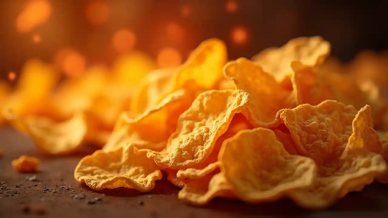 Generate an image of Lots of Potato Chips covered on fire, bright and saturated colors, elegant, highly detailed, sharp focus, 4k, Bright expressive colors, Dramatic Lighting, Depth of field, Incredibly high detailed, blurred infinite background.
