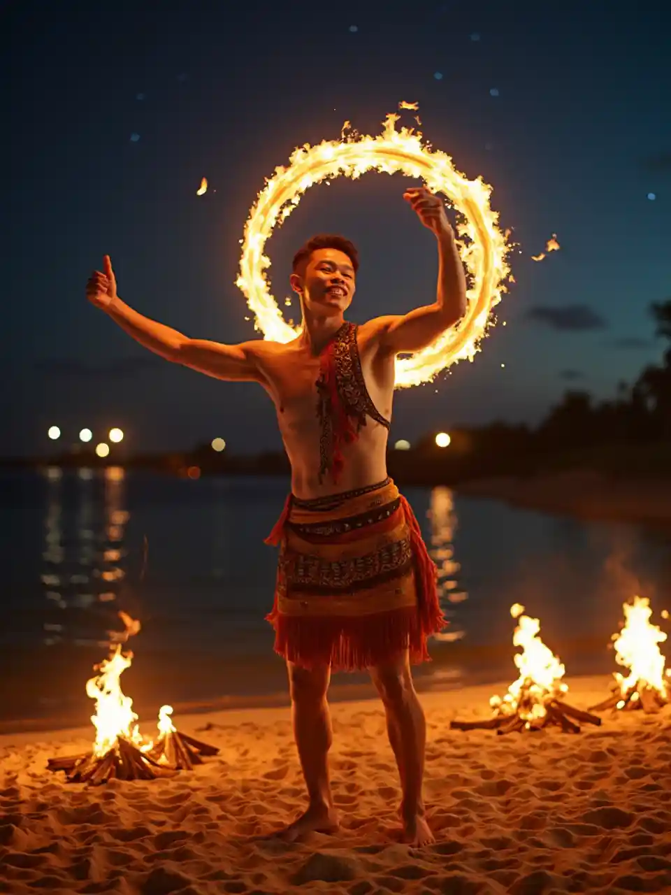 JocelynPerforming a fire dance on a tropical beach, an Asian man in his 25s glows in a tribal vest. Bonfires and starry skies frame him, his fiery spins radiating primal, dynamic charisma.