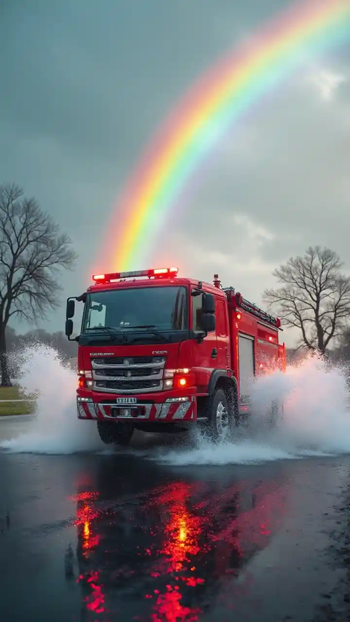 A Firetruck Shooting Water Towards a Beautiful Rainbow