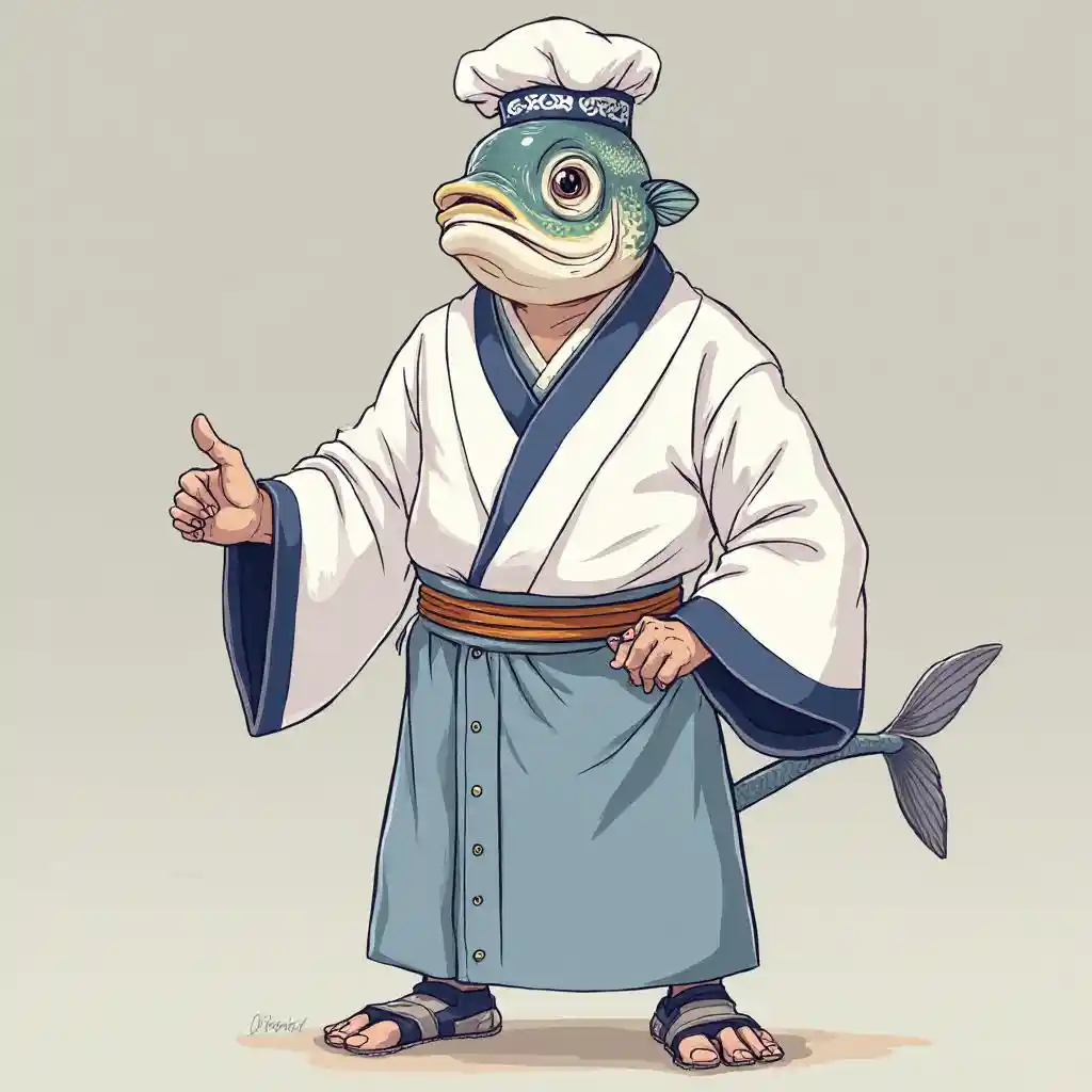 A highly detailed digital illustration of a refined Japanese humanoid fish man , standing upright in traditional chef robes (white with blue trim), sporting a t