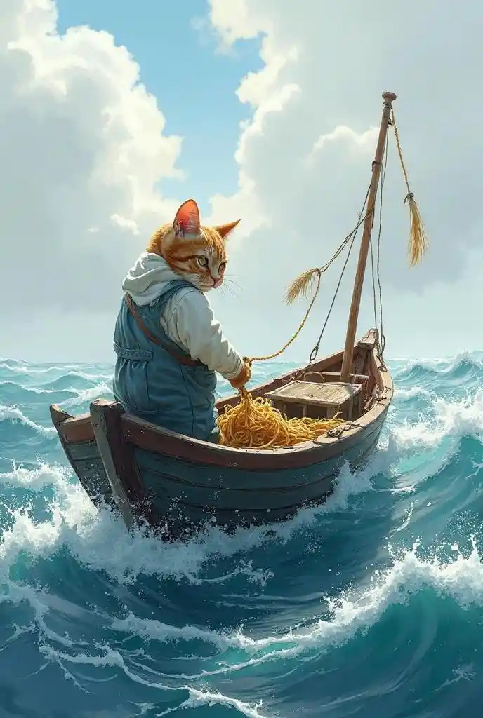 hyper realistic photo,a picture of a fisherman cat pulling a throw net on a small fishing boat swaying in rough waves in the ocean,頭には白い鉢巻を巻いています,Draw in detail