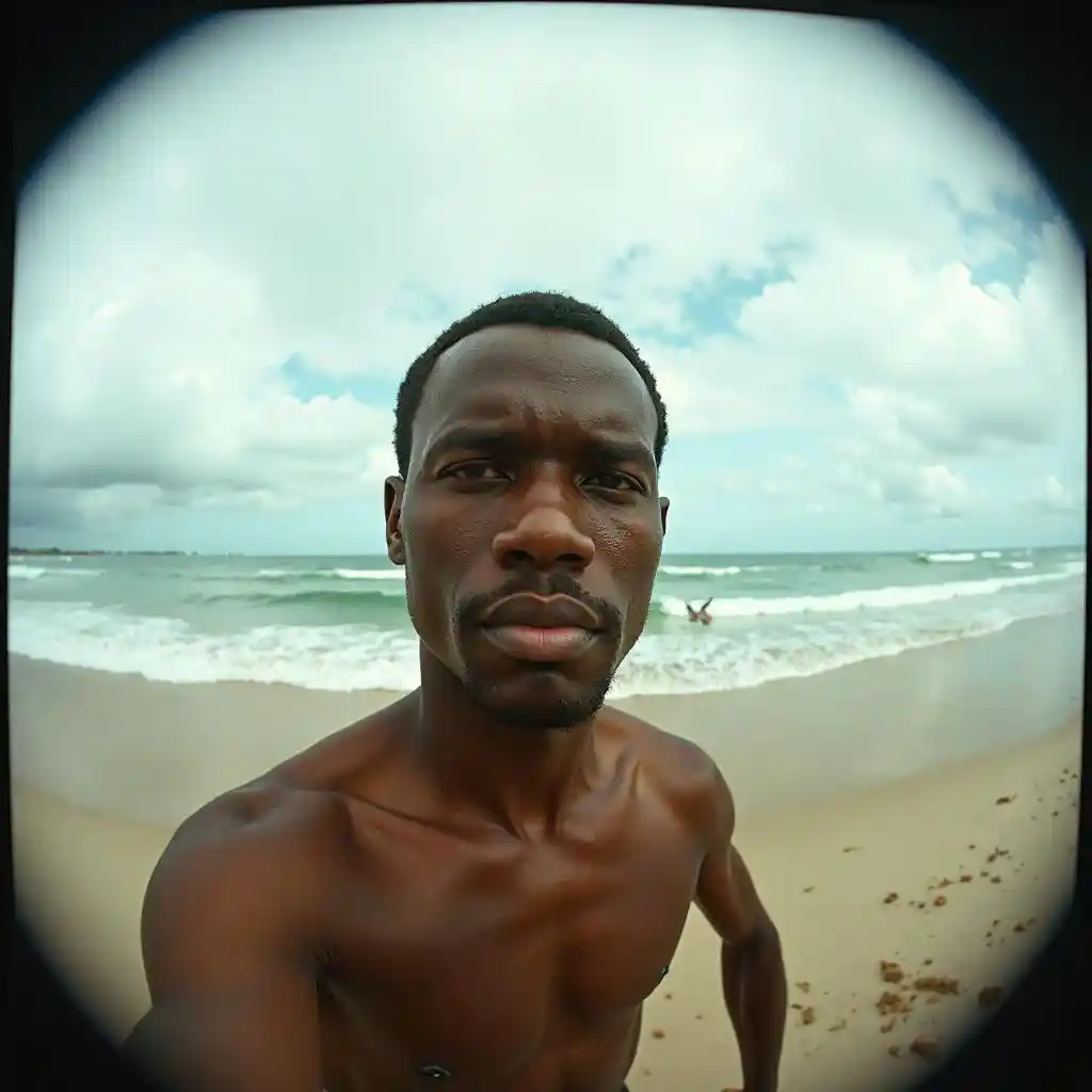 Photo of a black man at the beach, captured with an exaggerated fisheye lens effect in the style of TOK lomography. The wide-angle perspective distorts the horizon and surroundings, curving the edges dramatically, while keeping the focus on the man. The beach scene shows the ocean waves, distant horizon, and cloudy sky, all warped slightly by the fisheye effect. The colors are saturated, with a nostalgic, vintage lomography aesthetic, including grainy textures and high contrast, evoking a playful, dynamic atmosphere.