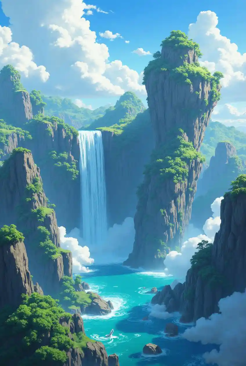 Floating islands and gravity-defying waterfalls, akin to a fantasy anime setting.