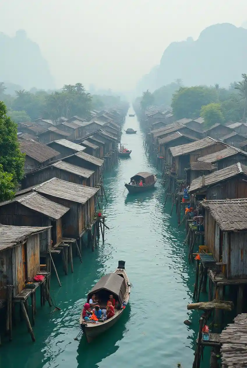 OwenA floating village, with houses on stilts and boats zigzagging between.