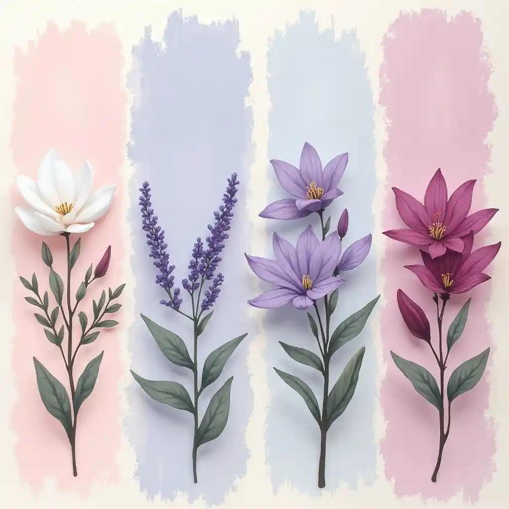 Four floral still life arrangements, presented in a painterly, impressionistic style. Each is a distinct color palette. The backdrop is a light cream, divided into four vertical sections, with broad, textured brushstrokes of blush pink, lilac, lavender blue, and dusty rose paint. The flowers are meticulously detailed, with a realistic, almost three-dimensional quality, yet with soft, painterly edges. A white magnolia, lavender, a light purple lily, and deep magenta lily flowers are arranged against their respective color strokes. Shades of muted greens and grays are used for the foliage, which adds depth and texture to the composition. The image has a delicate, romantic, and calming aesthetic.