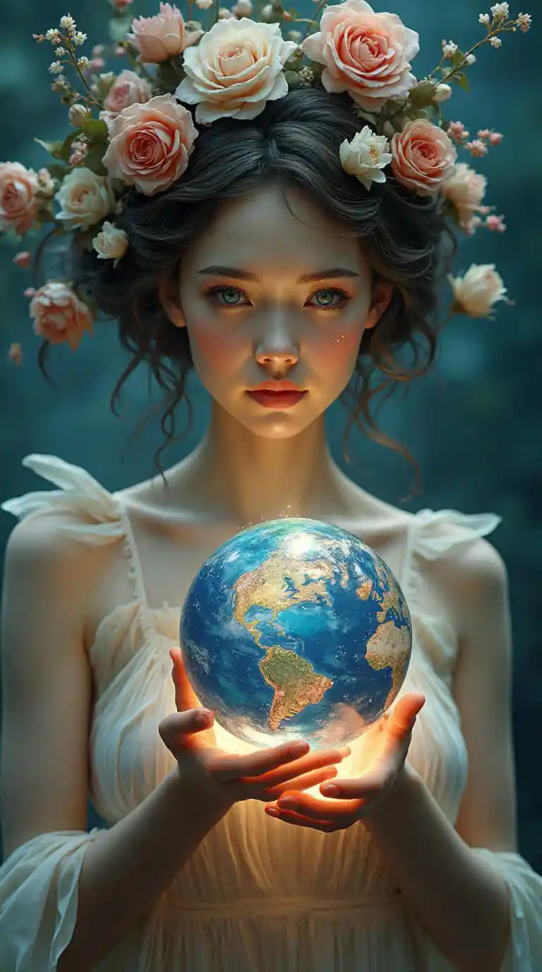 Ethereal Woman with Floral Hair Holding Cosmic Orb