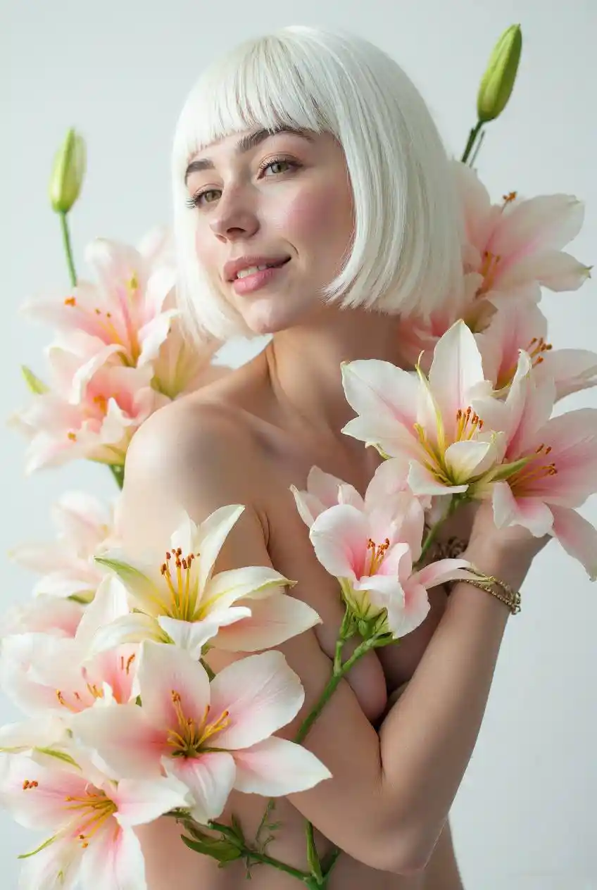 (Frontal shot) epic action scene, (hyper realistic), (RAW photo), (photorealistic), (masterpiece), (intricate details), (best quality), (ultra highres), Centered, side-view depiction of a aesthetic, happy playful female human flower hybrid, epic action scene, rendered in hyper-realistic, photorealistic style with intricate details, showcasing exceptional quality in ultra-high resolution. Her skin is a fusion of crinum litifoium flowers, white Lily in bloom face and a white, dirty, bob-cut white weave. she looks at the viewer with a gentle smile, in a crinum litifoium dress. Set against a vibrant white and pink background, while colorful flilies bloom around her neck and arms, adding a burst of vibrancy to the white plain background. The overall mood is demure, with a focus on showcasing the her dress, white Lily floral skin, and the contrast between her white floral physique and the organic, blooming flowers.