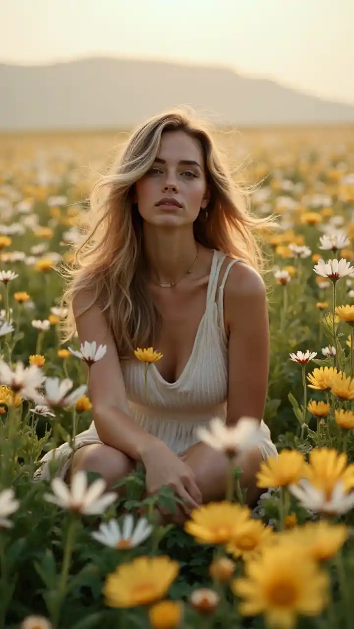 Field of flowers with woman sitting in the middle with hair blowing in the wind