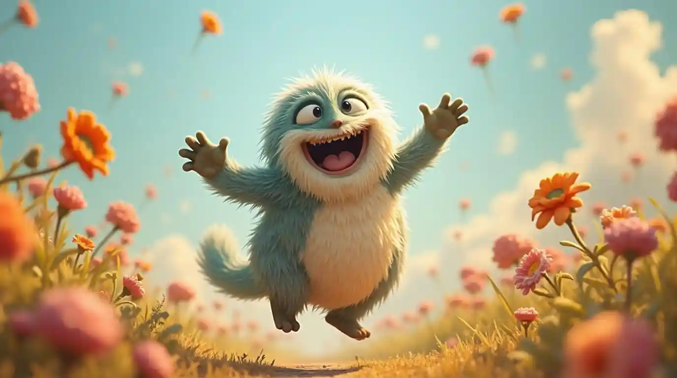 Ethanhappy fluffy monster jumping around covered in flowers