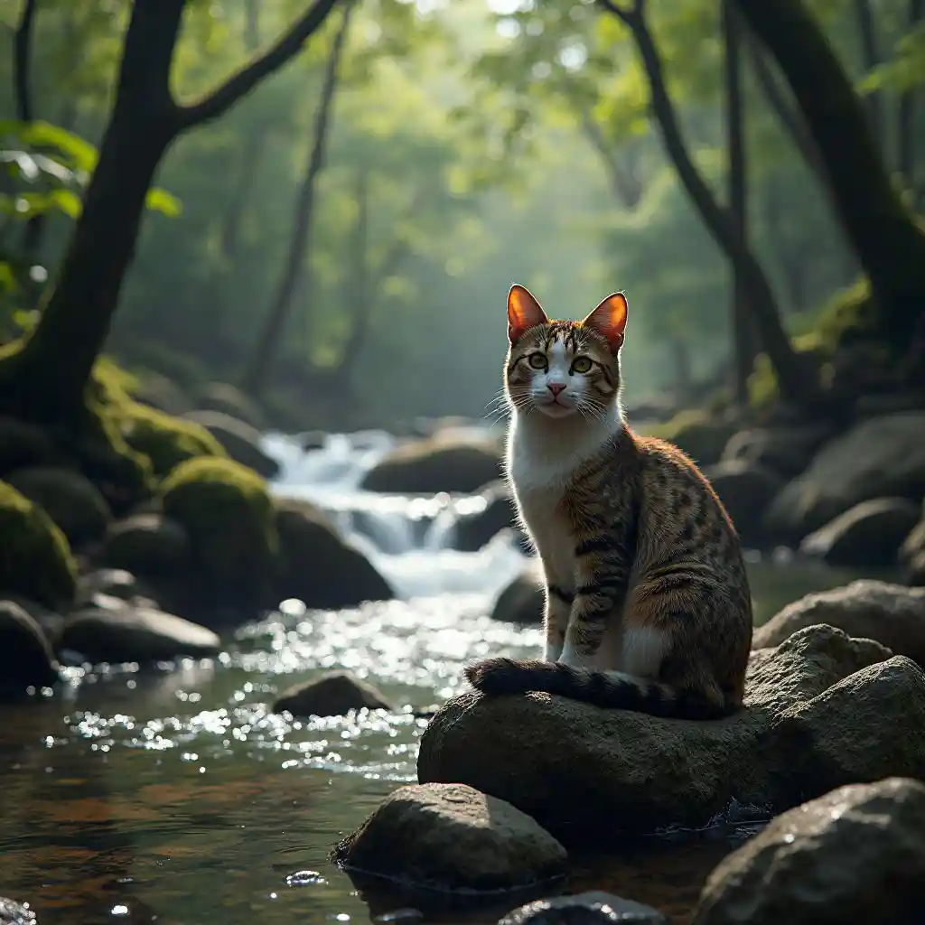 A cat sitting on a stone beside a stream passing over rocks in a deep forest