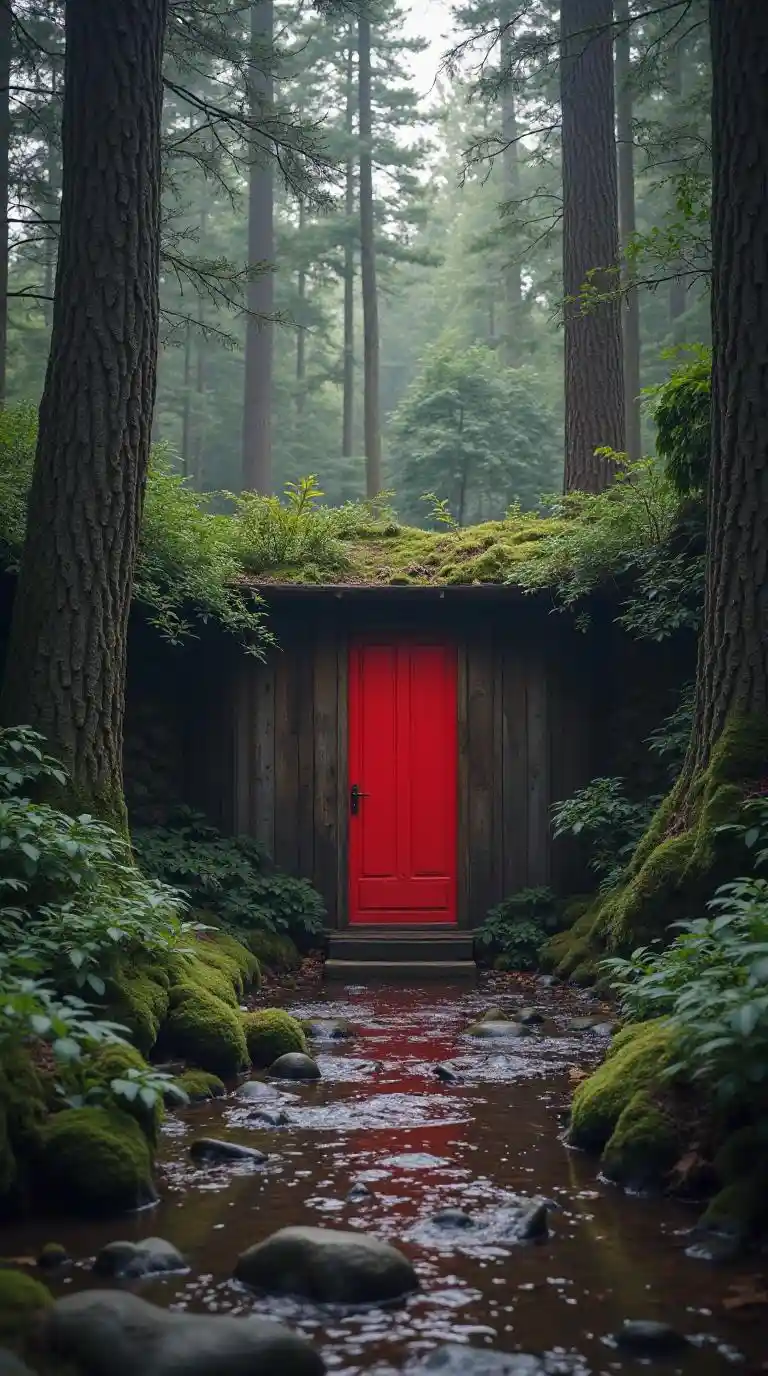 Yamya red door in the middle of the forest, the color red is very light, the river in the left and the forest in the back