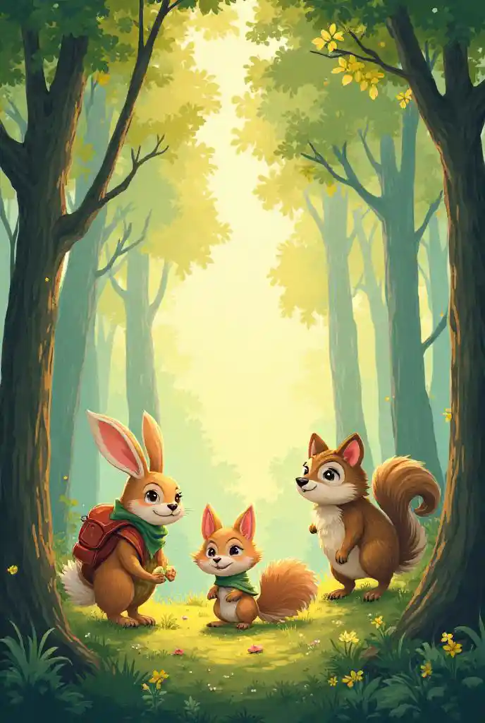 "ren's book cover titled 'Our Forest Map' . A warm and adventurous illustration featuring a cheerful bunny, a curious squirrel, and a wise owl exploring a magic