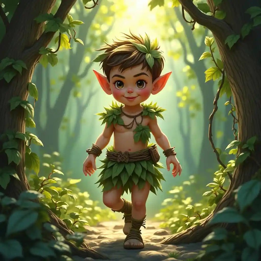 (A little boy pixie with a mischievous smile: 1.5), dressed in a leafy and twig outfit, showing his chest like a Peter Pan,( walking through a magical forest: 2.0),( surrounded by vines and ferns., digital painting, high resolution, fine details.magical theme,mysterious jungle background, The sunlight casts mottled shadows through the leaves to create a warm light effect,glowing,The sunlight casts mottled, shadows through the leaves to create a warm light effect,glowing, elf ears