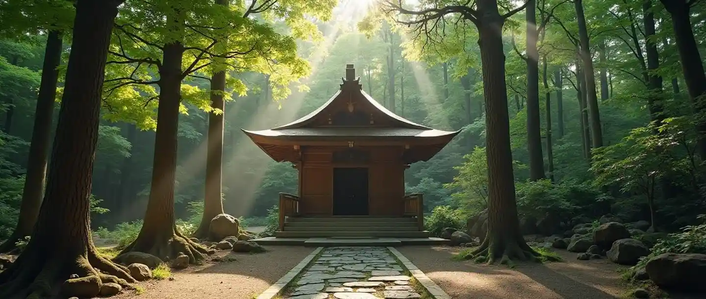 A small shrine in the woods, surrounded by tall trees and sunlight filtering through them. The building is made of wood with a thatched roof, creating an atmosphere reminiscent of ancient Japan. A large tree stands beside it, as if guarding the temple. Wide shot, summer day, in the style of Fujifilm GFX 50S