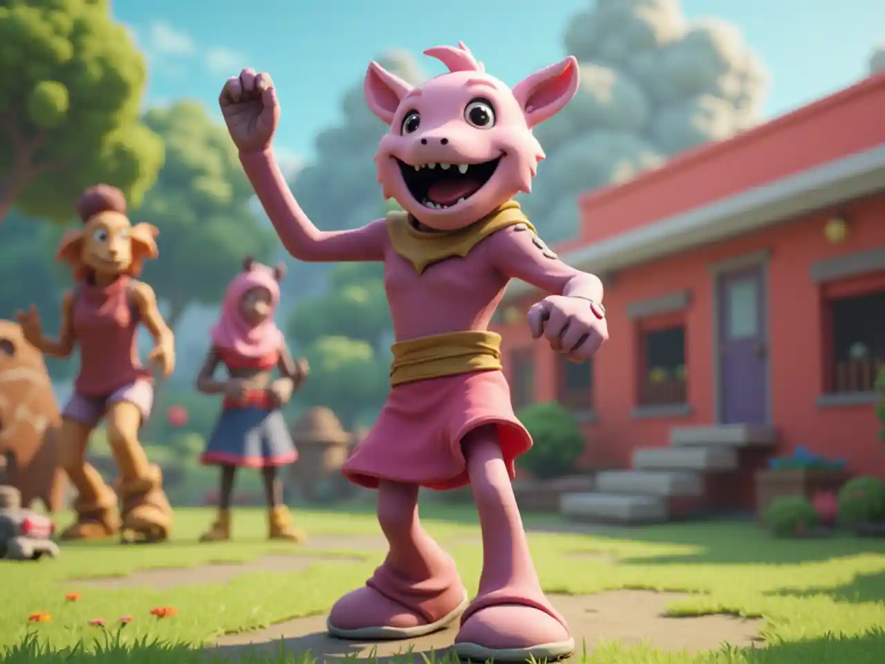 Peely from Fortnite dances in a colorful outdoor area with other blurry characters.