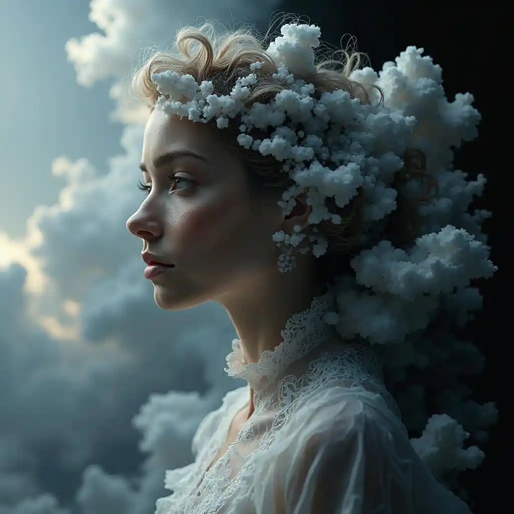 Adalynelegant gentle beautiful woman build with multiple mandelbrot merge with ferromagnetics, double exposure clouds merge waterfalls, background black with julia fractals