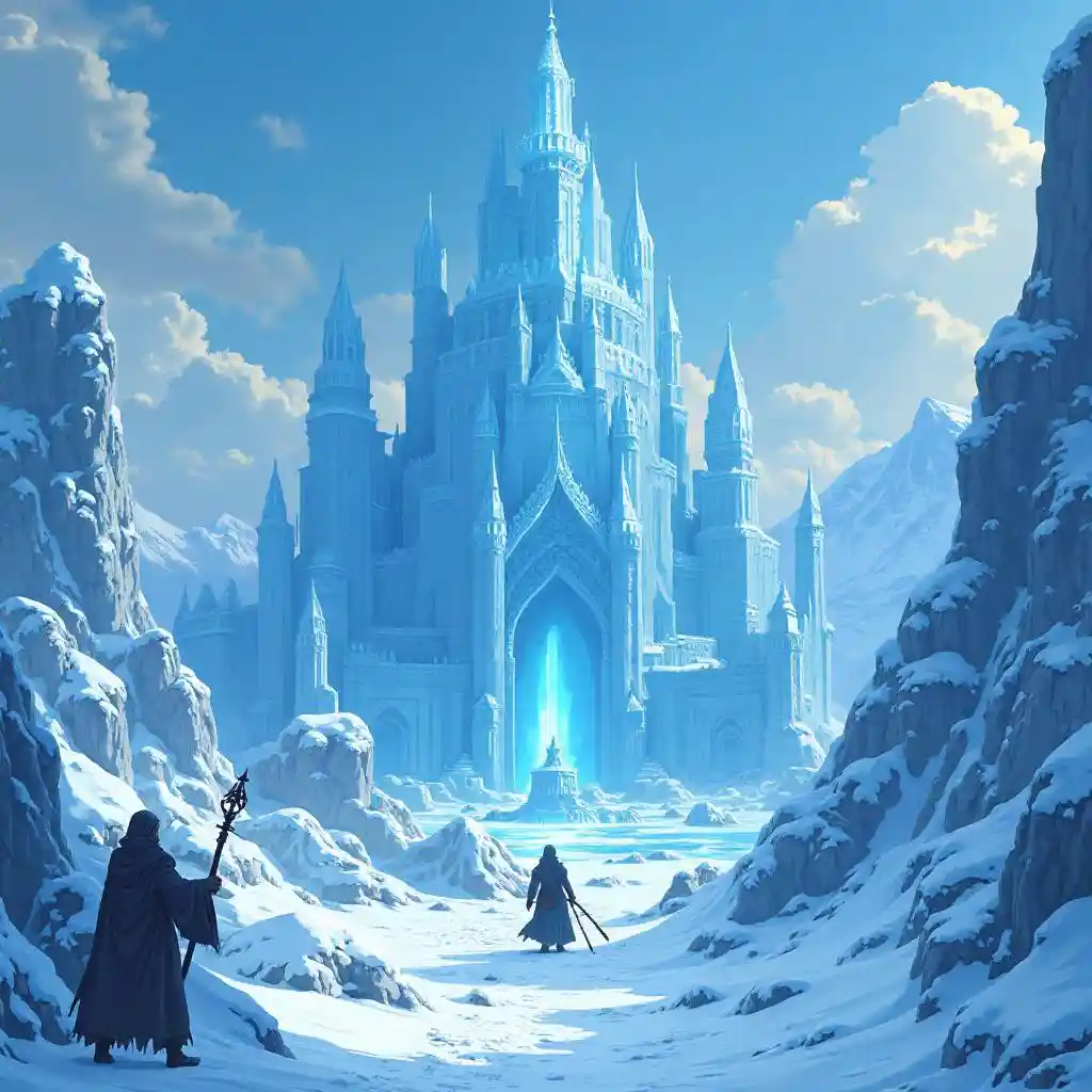 EthanIce citadel, frost mages and snow beasts, in a cool, fantasy anime style.