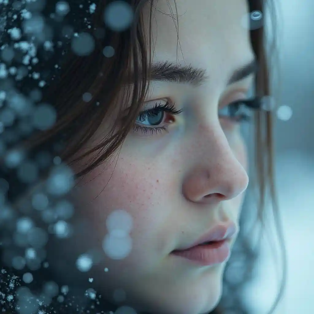 A close-up side-view of a young woman person's face, predominantly focusing on the eye and the surrounding area. The face appears to be partially obscured or merged with a textured, possibly snowy or frosty, background. The person's eye is closed, and the eyelashes are distinctly visible. The overall mood of the image is serene and introspective, with a touch of mystery due to the merging of the face with the abstract background.