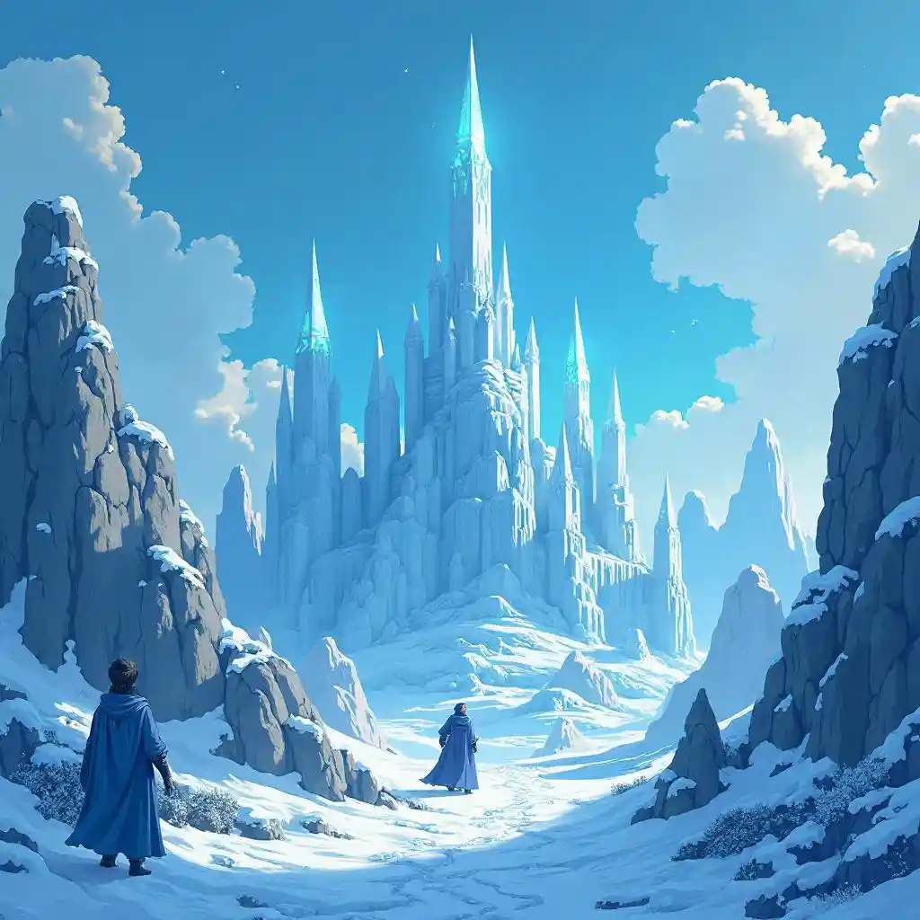 HarperIce citadel, frost mages and snow beasts, in a cool, fantasy anime style.