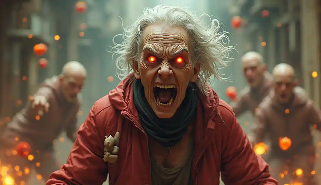 Luna4k, cyberpunk, An old woman. A terrifying expression. She's throwing fruit-shaped bombs. Enemies are blown away.