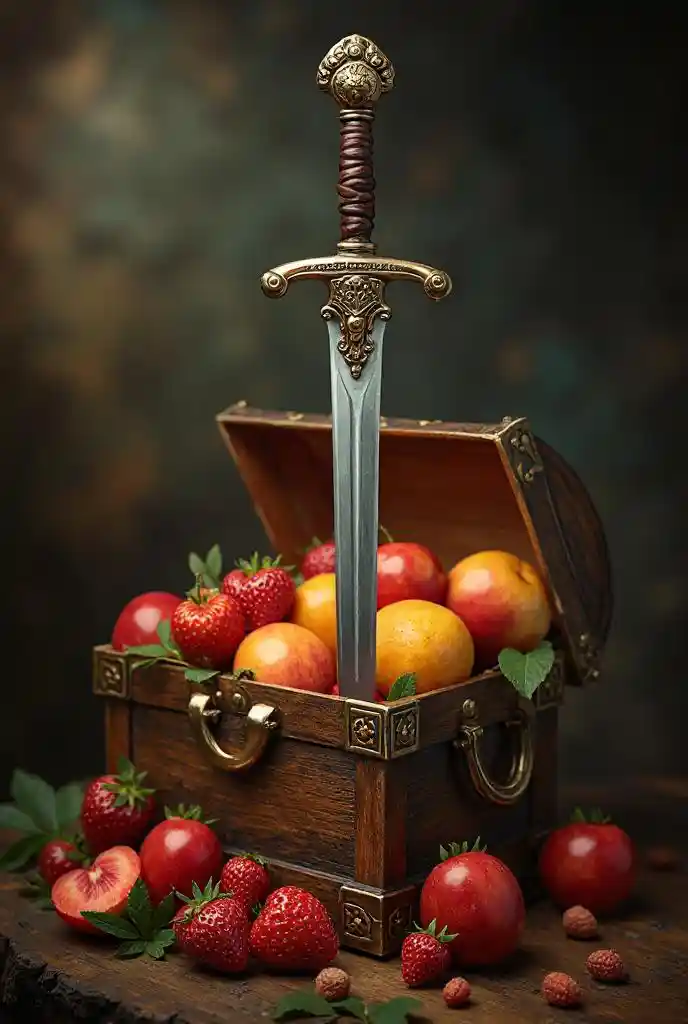 masterpiece,best quality,sword made from fruit in a treasure chest