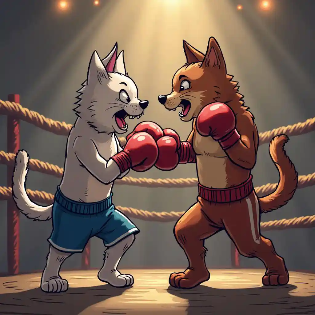 ynamic anime art style, action shot of an anthropomorphic cat and an anthropomorphic dog wearing boxing gloves, fiercely fighting inside a boxing ring with rope