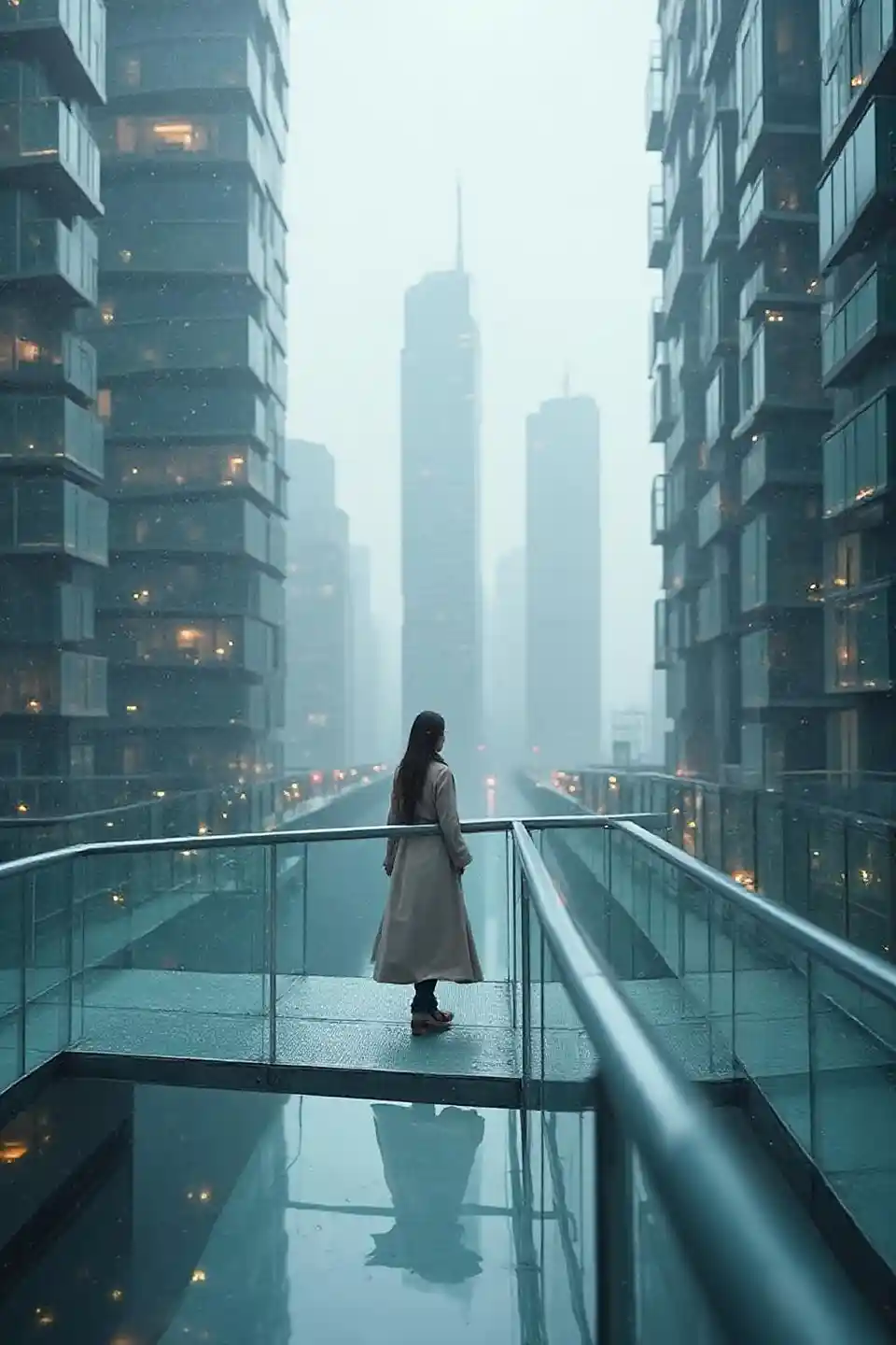 A woman living in a new city of the future is crossing a bridge connecting high-rise buildings made of glass,It is protected from rain and snow because it is su