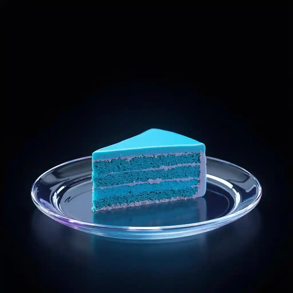 Chloeclean minimalistic. simple, plate with slice of blue cake, Transparent/ Wireframe /, futuristic, black background, iridescent