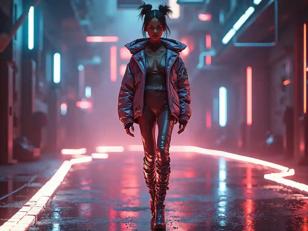 (masterpiece, best quality, ultra-detailed, futuristic fashion editorial), full-body portrait of a cyberpunk model walking on a glowing runway in the year 3025,