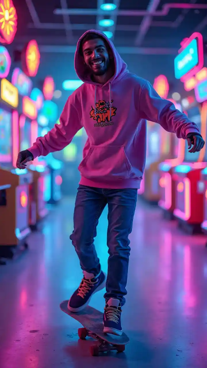 Skateboarding through a holographic arcade, a Middle Eastern man in his 20s glows in a neon hoodie. Glowing games and pulsing lights frame him, his daring tricks and bold grin radiating youthful rebellion and futuristic charisma in a vibrant, high-tech setting.