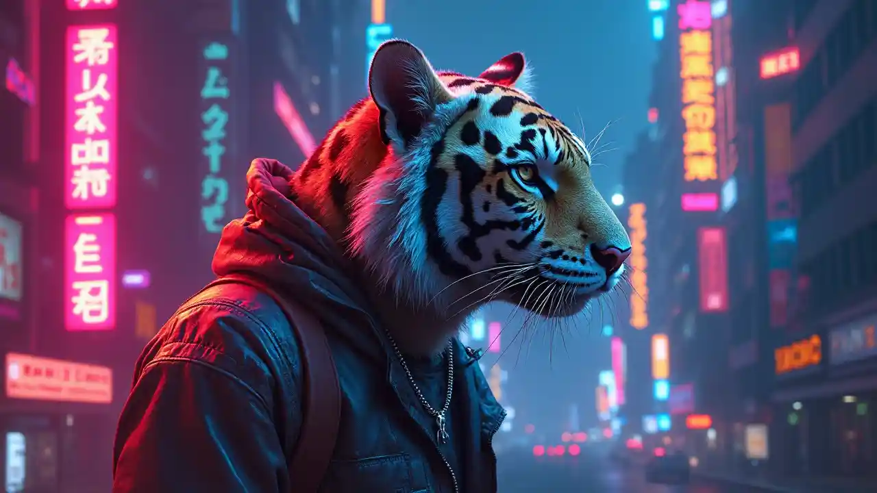 Futuristic Tiger Costumed Among Skyscrapers in Cyberpunk Scene