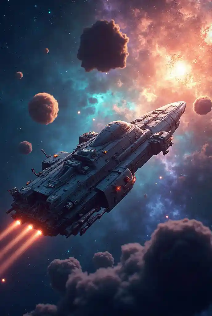 BenjaminA cosmic galaxy with bubbling Planets of colorful colors, a cruiser Flying like a shoe Conquers the vastness of the universe,