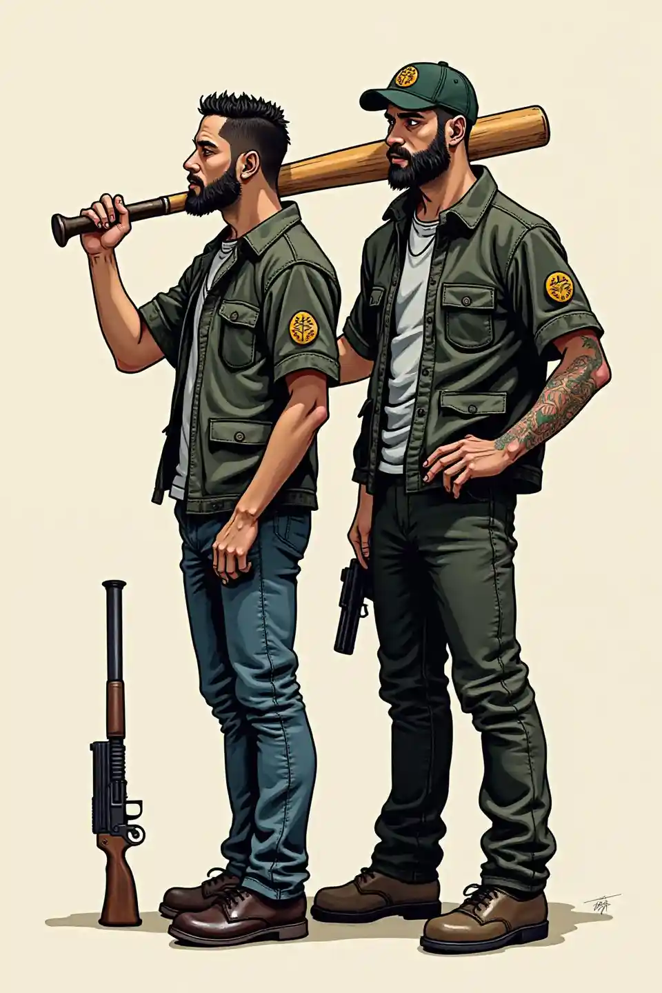 Two guys, Hispanic appearance, street gang members, , one is holding a baseball bat (throwing it on his shoulder), The second guy is standing (Beretta 92 gun be
