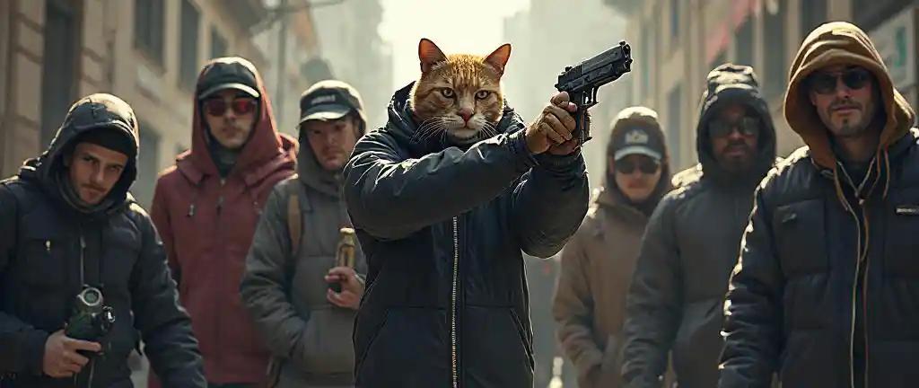 Kemono,cat,Humanoid(頭の形はcat,the body is a gang member)10 people,,Road(Fight,fight ,Gunfire,war),gang costume(jacket,accessory,street,Pistol),realistic backgroun