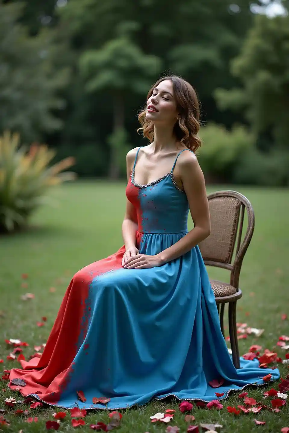 LeilaA woman in a dress in a color that looks like blue and red paint was thrown at the same place at the same time is sitting on a chair in a large garden in her ya