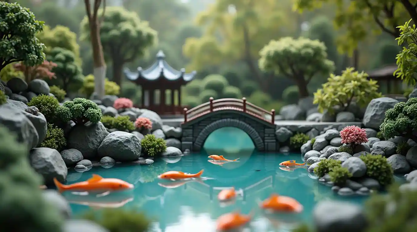 Product Photography There is a miniature model of Jiangnan landscape garden, arch bridge, clear pool, Koi, rockery, round arches, ancient ladies, large aperture, accent lighting, colour temperature 6400K, monochrome background, Lycra, film style, full view, you can see all the delicate model on the table.
