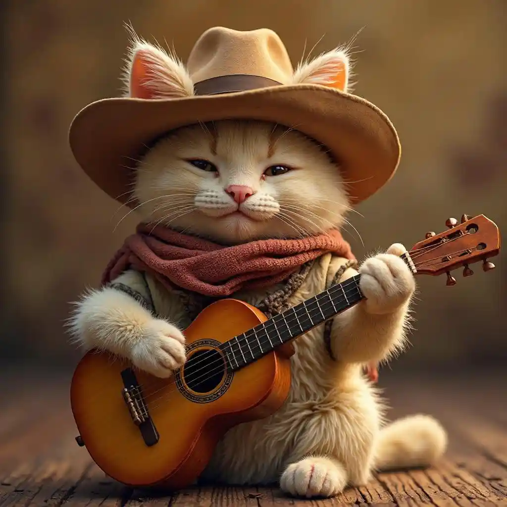 JacobFilhote de gato branco muito fofinho com chapéu de cowboy e tocando violao