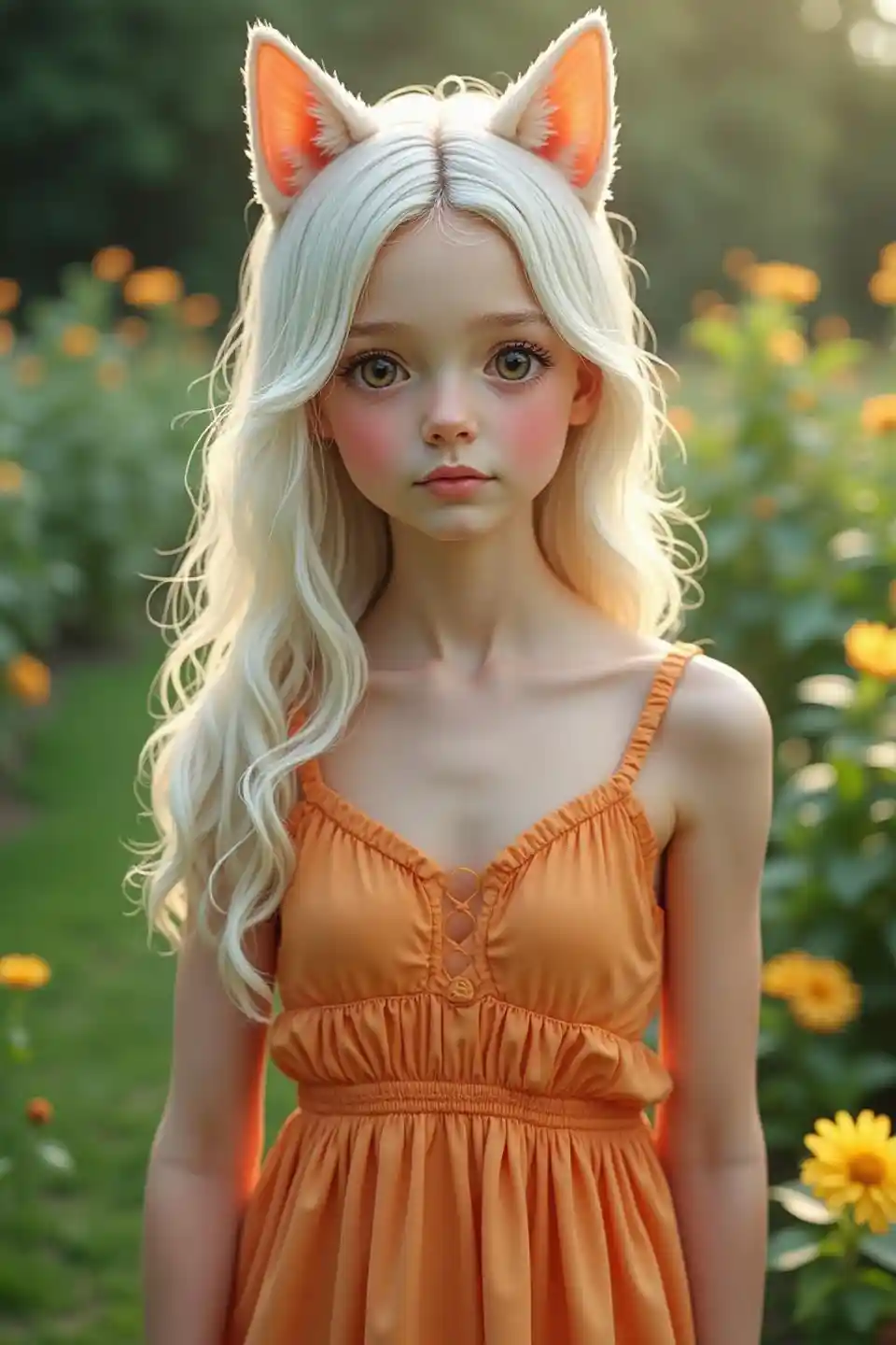 portrait: young German girl with long white hair with cat ears, as a real sexy girl in the garden, In a pastel orange summer dress with a large neckline, A cut
