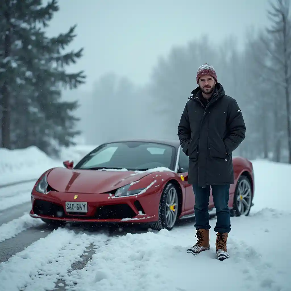 Peytonsad german man standing next to a ferrari in bad snowy cloudy cold weather in winter