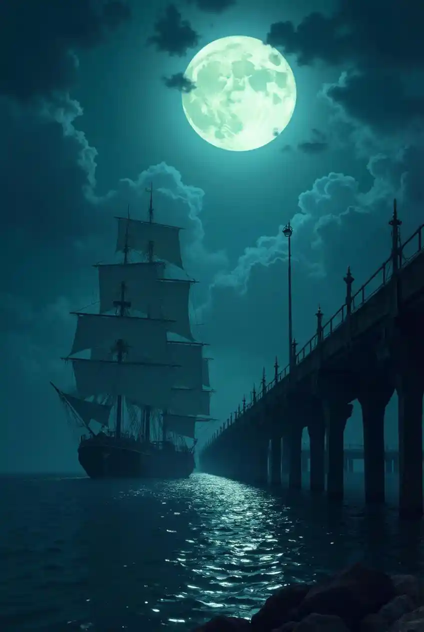 OliverMoonlit pier, ghostly ships arriving, channeling eerie supernatural anime aesthetics.