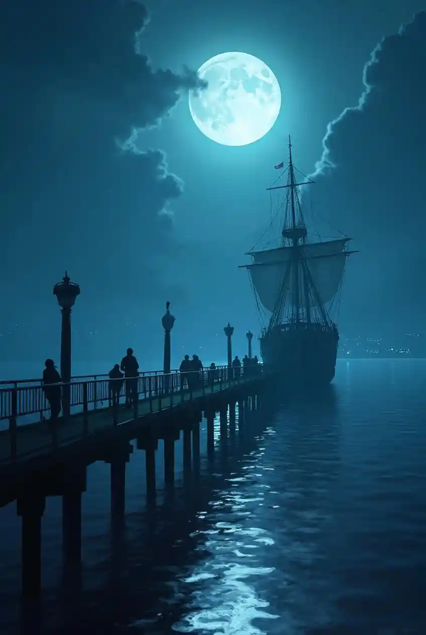 Moonlit Pier with Ghostly Ships in Anime Style