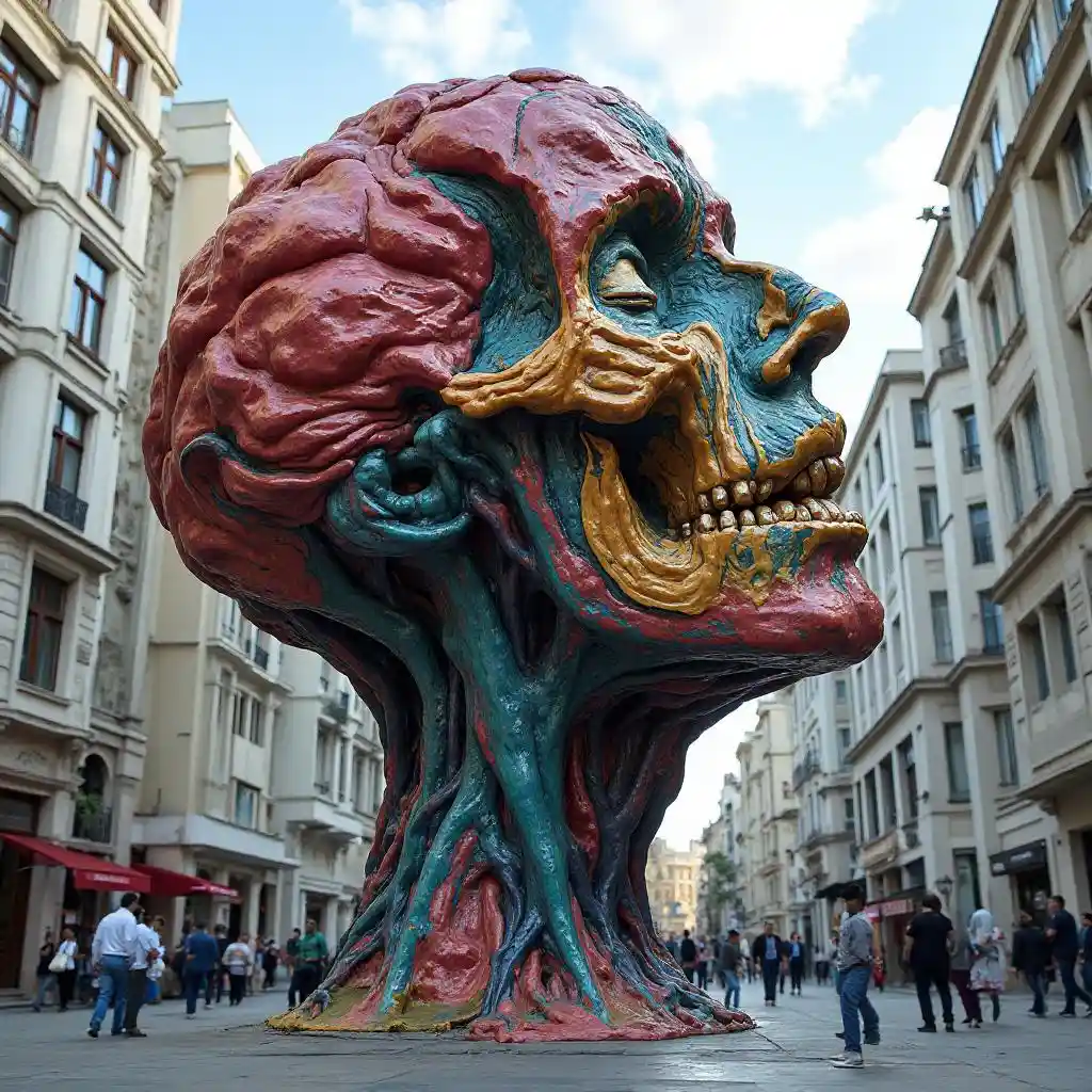 Una cabeza monumental, hecha de fluido vivo , musculos, sangre y tejidos.Varada en medio de la ciudad, a un lado de la costa, su tamaño es tan impresionante, que hace ver a los edificios diminutos. Llena de colores, obscuros