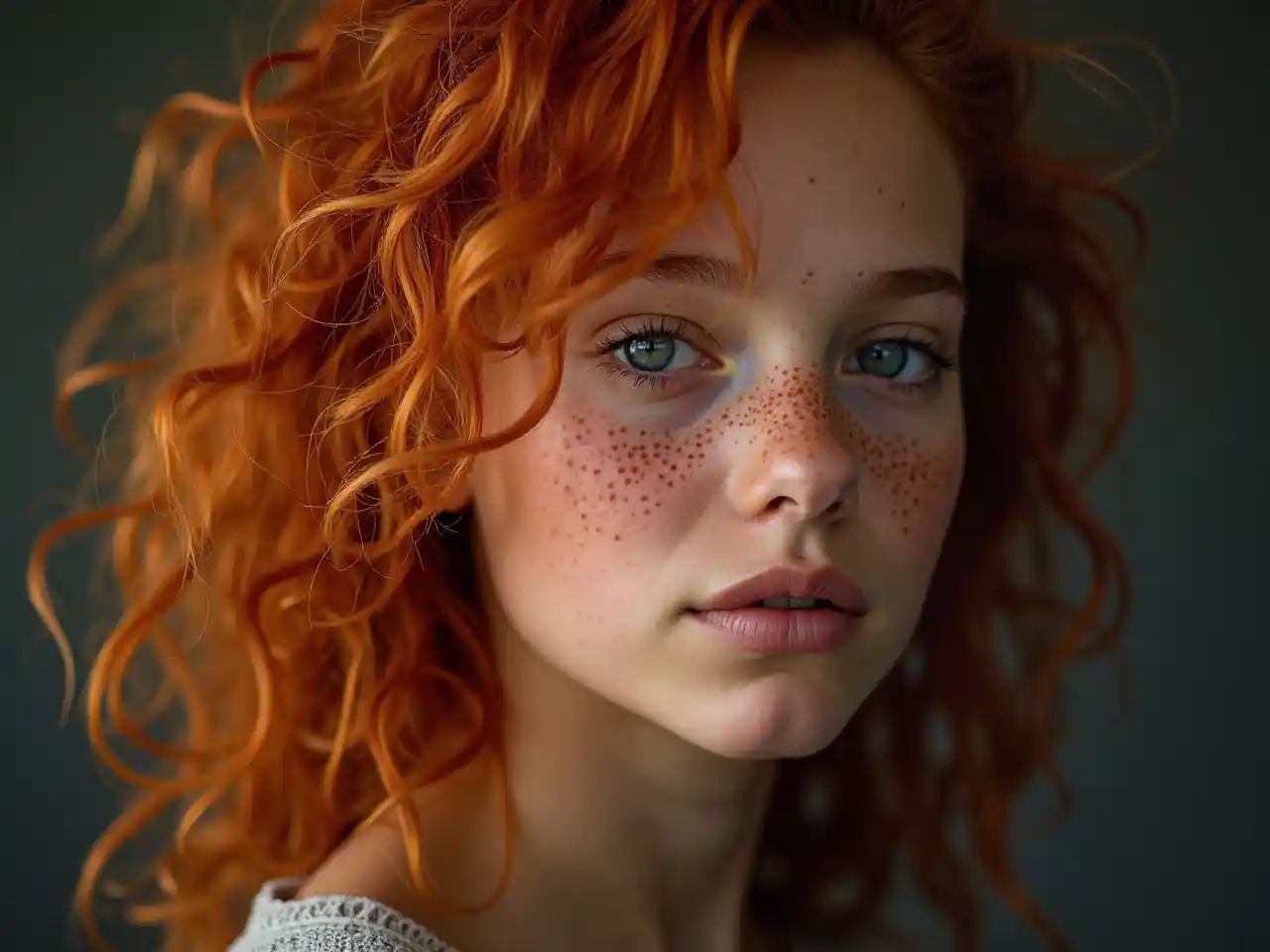 black girl with ginger hair, freckles on the face, professional photo, sharp on details